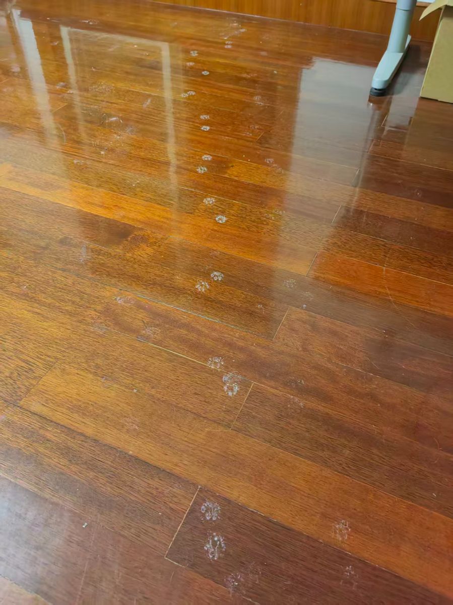 光亮的木质表面把爪印的白色衬得格外明显,与深沉的红棕地板形成有趣的对比。画面右上角露出的椅腿和纸箱一角,让场景多了几分生活气息,而这些灵动的小猫脚印,又给略显规整的室内空间添了几分软萌的趣味,仿佛能看见小猫踩着小碎步跑过的可爱模样。