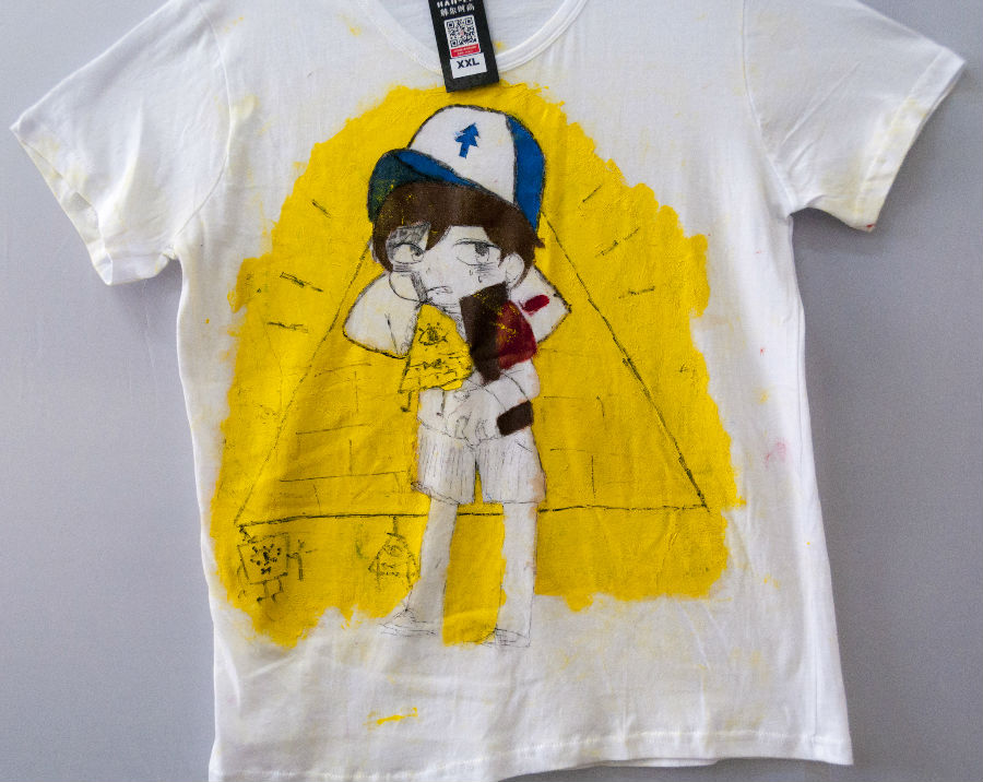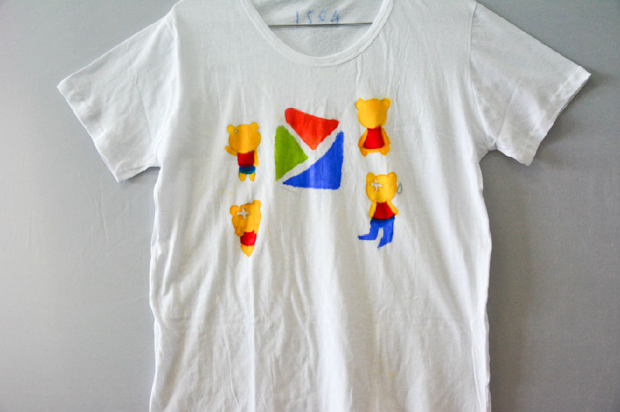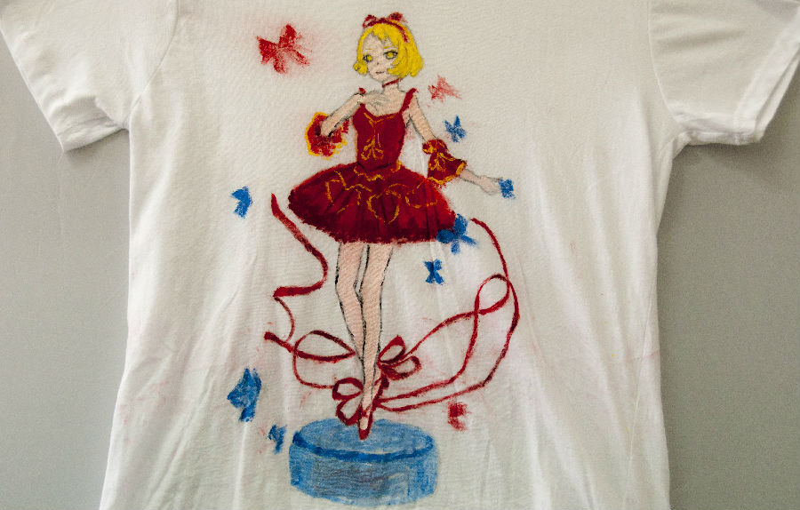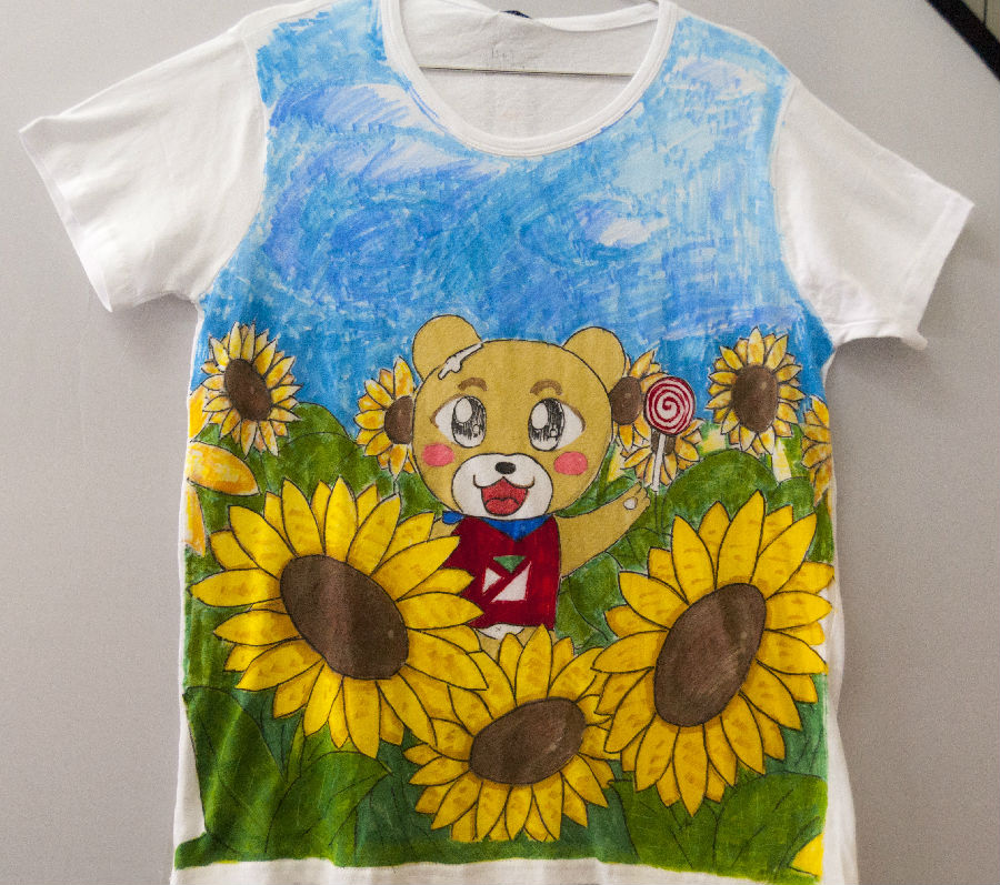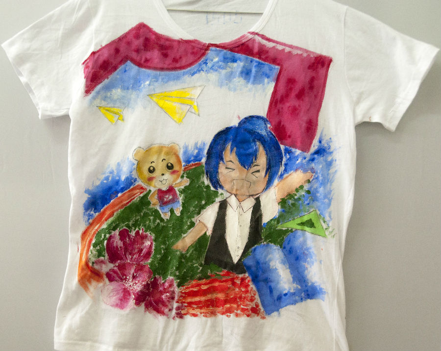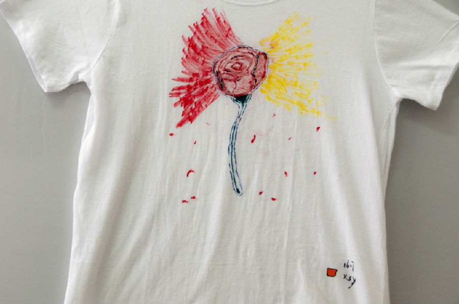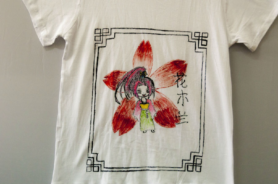 设计理念:夏日的燥热让人联想到春日空气中花草的芳香,而桃花就在这燥热的季节中增添一种小清新。桃花的制作我们是用橡皮刻出画的形状再印在衣服上,龙猫无脸男这个可爱的动漫人物在当今颇受大家的欢迎,所以我们则是把他们画在了衣服上,而龙猫、无脸男的特点就是守护他人;所以穿上这件衣服就会有一种被人守护的感觉。因为入夏时,桃花的凋零所以画上桃花就如同龙猫、无脸男守护者将要凋零的桃花。