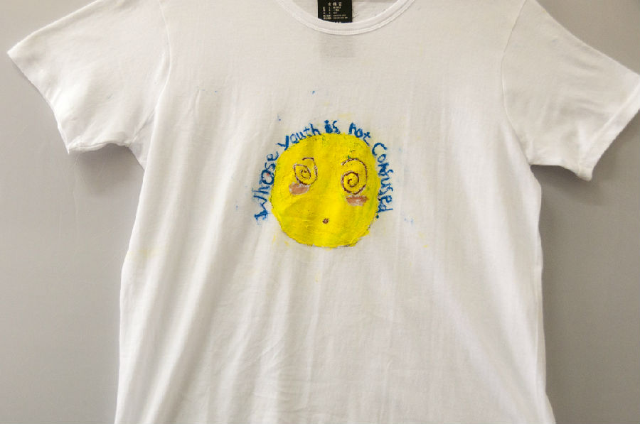作品简介:我们的作品是简简单单的在T恤上只有“青春无畏”四个字。还有一个手掌印。