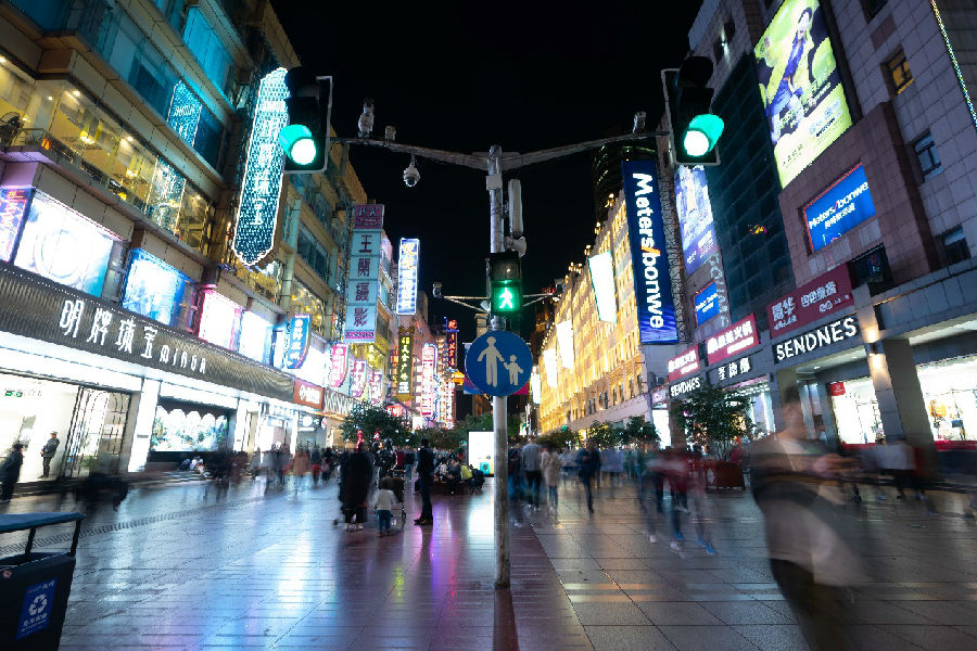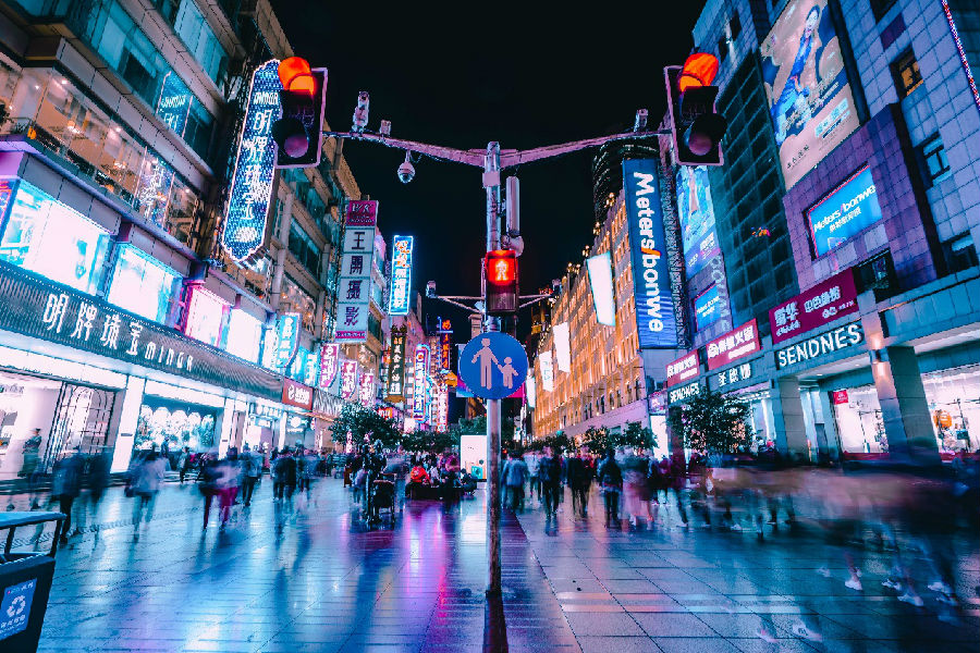 原图是南京路的街头景色,色彩上带有大片粉色,所以拍摄的时候就想到赛博朋克的风格。但手持夜景没有脚架,画面较暗,路灯带来的黄光,使画面看起来平庸,看上去就是一张废片!但是!别忘了我们可以后期的呢!