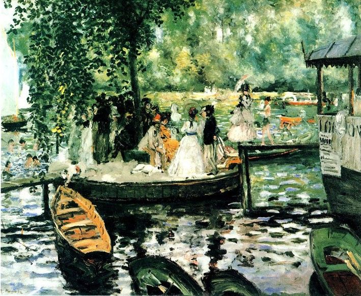 1870年,雷诺阿已29岁,事业上还未露头角,经济上又处于拮据状态,不时要光顾当铺,不得不多次地从一个阁楼搬到另一个阁楼。就在此时期,他去阿让特依,跟随莫奈去户外写生,去理解和感受大自然中的光色效应。