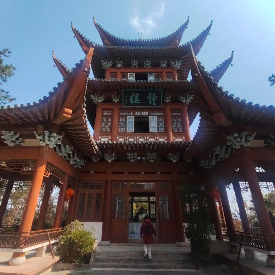 朱红飞檐,黛瓦青砖,一座钟楼傲然立于天地之间,尽显中式古建筑的典雅与威严。楼檐层层上翘,如飞鸟展翅,檐下的斗拱精雕细琢,繁复却不失章法,每一处细节都藏着古人的匠心。匾额上的题字笔力浑厚,红灯笼在蓝天下随风微晃,为古朴的建筑增添了几分灵动。一位行人拾级而上,背影融入这厚重的建筑之中,仿佛正沿着时光的阶梯,探寻一段尘封的历史。站在楼前,既能触摸建筑的历史温度,又能眺望远处的湖光山色,自然与人文在此刻完美交融。