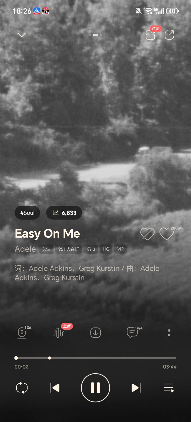 这是一张音乐播放软件的截图,正在播放英国歌手Adele的经典灵魂乐作品《Easy On Me》。界面采用黑灰渐变的沉浸式设计,背景是朦胧的黑白郊野风景,契合歌曲舒缓深情的氛围。顶部显示时间18:26、5G网络等状态栏信息,中间标注歌曲名、歌手名,以及#Soul标签、6833的热度值,还有951人在听的实时数据,词曲作者为Adele Adkins与Greg Kurstin。底部是完整的播放控制栏,进度条显示歌曲播放至00:02,总时长03:44,循环、切歌、暂停、播放列表等功能按钮清晰,评论区1w+、收藏200w+的数据,凸显了这首全球爆款单曲的超高人气。