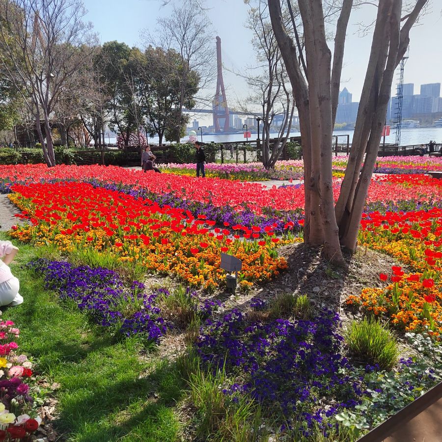 春日的杨浦滨江,是被鲜花铺满的浪漫天地。大片郁金香顺着江岸肆意绽放,红的热烈、黄的明媚、紫的雅致,层层叠叠织成了彩色的花毯。江风带着水汽拂过花海,混着草木的清香扑面而来,让人瞬间卸下所有疲惫。