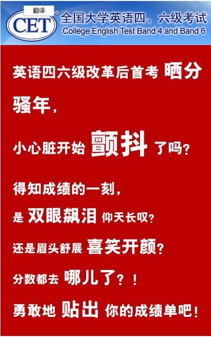 英语四六级考试成绩今日9时发布,考生届时可上99宿舍网(cet.99sushe.com)或中国高等教育学生信息网(www.chsi.com.cn/cet)免费查分,或通过手机发送A加15位准考证号到1066335577查询(资费1元/条)。特别提示,河北地区中国移动手机用户发送8加15位准考证号到10661660查询。