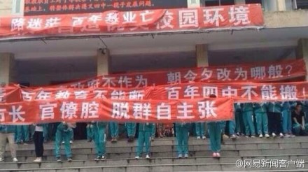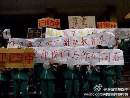据新华网,网友爆料,遵义市欲因规划问题,欲将当地著名的“遵义四中”整体搬迁,但因与政府之前承诺的说法矛盾,而新址又出现面积缩水,引发师生大面积抗议。此外,当地官员要求校长处理不好就走人,校长觉得愧于师生而下跪,老师们受不起也纷纷下跪。