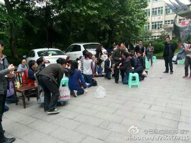 网传遵义市欲将文化小学(遵义市文化小学始建于1906年,是全国160所名校之一)整体搬迁进遵义四中老校址,而安置遵义四中师生的新校区被曝有占地面积被消减以及建筑质量问题,引发四中师生大面积抗议,在微博上引起热议。图为网传遵义四中老师集体下跪照。