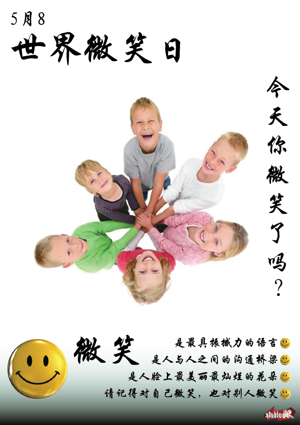 微笑是世界通用的语言,这个自1948年创立的节日,以其独有的温馨和魅力,为我们生活的这个世界增添了很多温暖。微笑同生活中的阳光、空气、水分一样重要。一项关于“和谐社会”的调查显示,八成以上民众认为“微笑”最能展示一个地方的和谐程度。微笑是人类最好的心态,微笑是人类最靓的表情,微笑是人类最美的语言。让我们把微笑写在脸上,把真诚与温暖带给他人,用微笑浇出和谐的花儿.