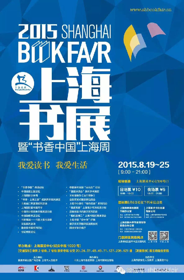 经过一年时间的精心准备,以“我爱读书,我爱生活”为主题的2015上海书展暨“书香中国”上海周将于8月19日至25日在上海展览中心举行。本届书展由国家新闻出版广电总局、上海市人民政府主办,中共上海市委宣传部和上海市新闻出版局承办,上海市静安区人民政府协办,组委会办公室设在上海市新闻出版局。